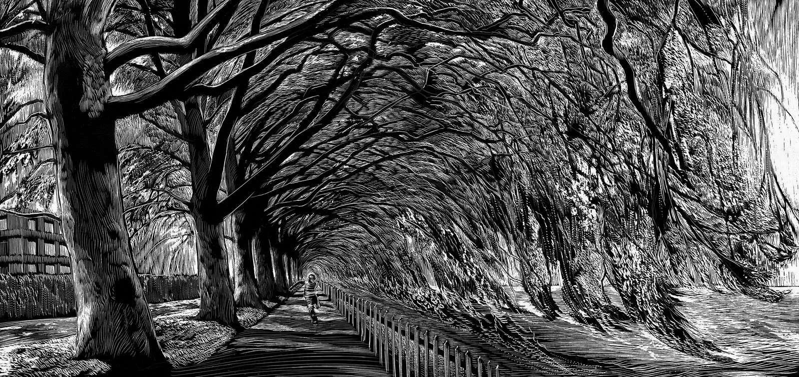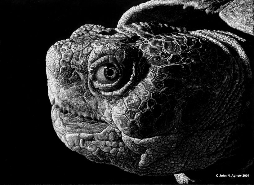 My most recent knife is an Olfa art knife (yellow handle). I like the short blade. It seems to give me good control and very fine lines. The knife with the black handle has a #16 blade. It comes in handy for wider scratches. The scratch width can be varied by holding it at different angles to the surface. The thicker knife with the silver handle is what I have tended to use for very fine work. It holds a #2 blade – very similar to the smaller #11 blade (the most common Xacto blade)